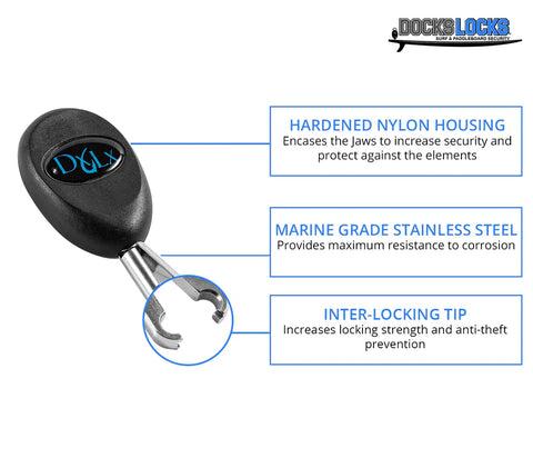 SÉCURITÉ ANTIVOL BREVETÉE. Le DocksLocks Jaws Lock est un dispositif de verrouillage breveté conçu pour protéger les planches de surf et les planches à pagaie SUP contre le vol.
